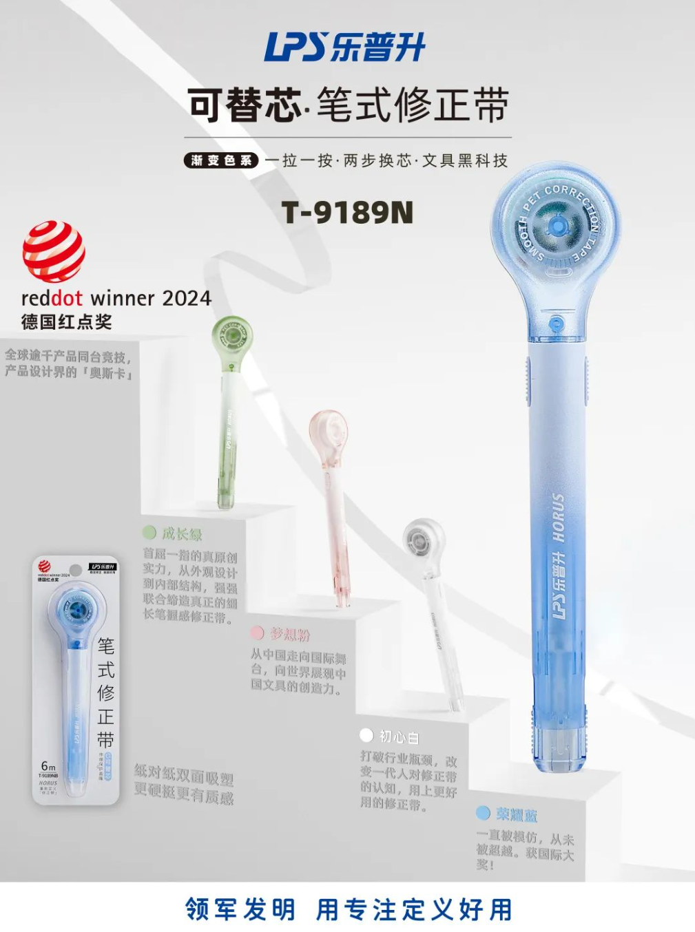 樂普升9189筆式修正帶:開創筆式修正帶先河,獨輪卷帶結構,將修正帶的便攜性與書寫工具的操控感完美融合,實現“修正像書寫一樣順滑”!榮獲國際設計界奧斯卡——德國紅點獎權威認證。